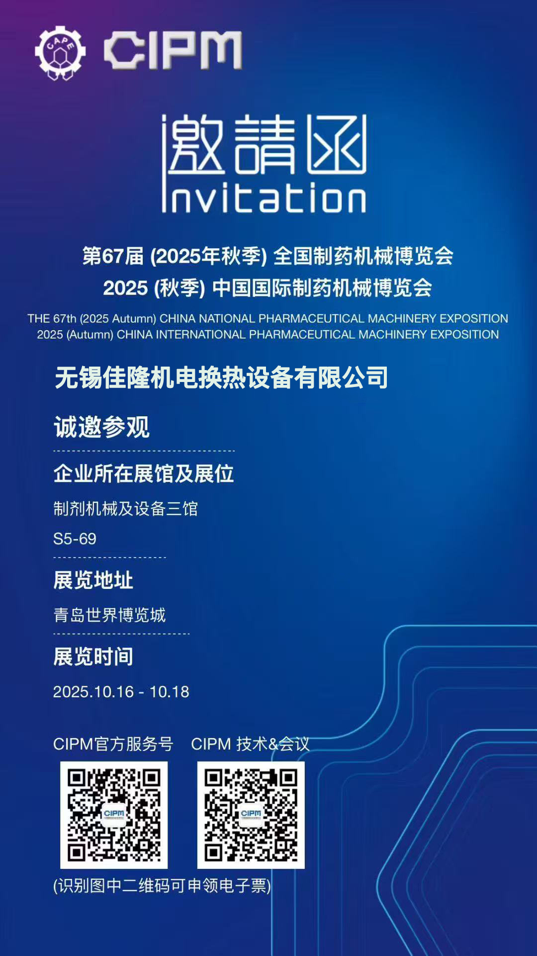 | 展会预告 | 制剂机械及设备三馆 S5-69展位,我们青岛不见不散! 2025年10月16日至18日,医药制药行业年度盛会——CIPM技术&会议展会将在青岛世界博览城隆重举行。国内换热与空调设备领域的知名企业——无锡佳隆机电换热设备有限公司,将盛装亮相制剂机械及设备三馆S5-69展位,为来自医药、化工等领域的专业观众带来其精心打造的系列换热设备与空调环境解决方案。 专业积淀,产品应用广泛 无锡佳隆机电是一家专业从事各类换热设备和空调设备设计、生产与制造的公司。其核心产品线涵盖绕片、双金属轧片、套片、串片等多种工艺的散热排管。公司主打产品“散热器”(亦称为“空气换热器”或“空气冷却器”),功能强大,既可通过蒸汽、高温水或导热油来加热空气,也可通过低温水、氟利昂等介质冷却空气,广泛应用于热风采暖、空调、烘干、冷却、除湿等工艺环节。在医药、化工、轻工、造纸、印染、木材干燥、大型钢铁厂、电机冷却等行业拥有极其广泛和成功的应用案例。